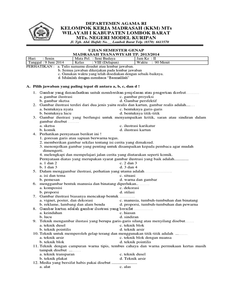 Soal uas seni budaya kelas viii 1. Pemerintah kabupaten bojonegoro dinas pendidikan smp negeri 1 ngraho jl. 1 seni budaya 20082009 soal ujian tengah semester ganjil madrasah tsanawiyah se kkm mtsn malang iii tahun pelajaran 20082009 mata pelajaran.